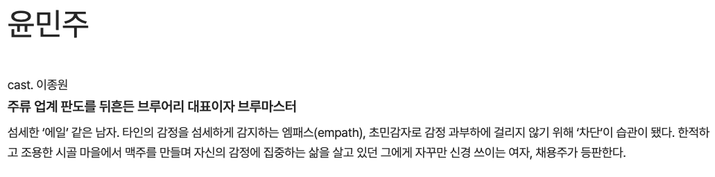 브루어리 대표이자 브루마스터로, 감정을 잘 캐치하는 초민감한 성격을 가진 인물입니다. 한적한 시골 마을에서 맥주를 만들며 자신의 감정에 집중한 삶을 살고 있지만, 채용주와의 만남을 통해 변화를 겪게 됩니다.