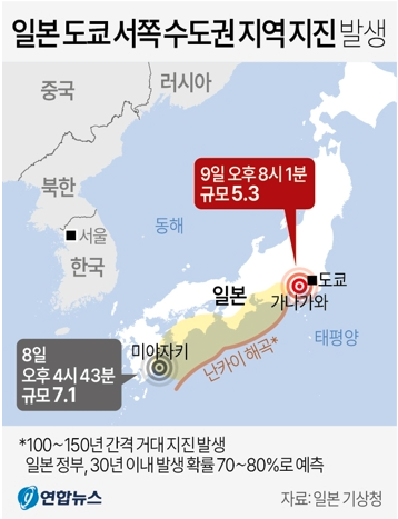 8월 9일 오후 8시 1분, 일본 도쿄 서쪽 수도권 지역인 가나가와현에서 규모 5.3의 지진이 발생했습니다.